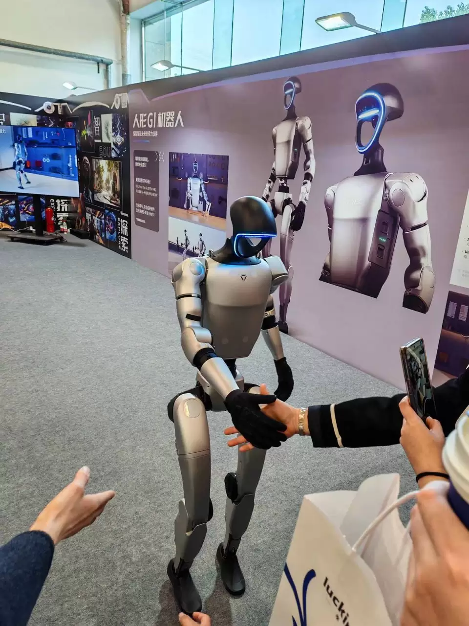 “2025环梦·AI智能机器人科普展览”在上海世贸展馆举办。进门比较抢眼的是人形G1机器人,大家都争相与机器人握手。虽然G1人个头不高,走起路来别有感觉。